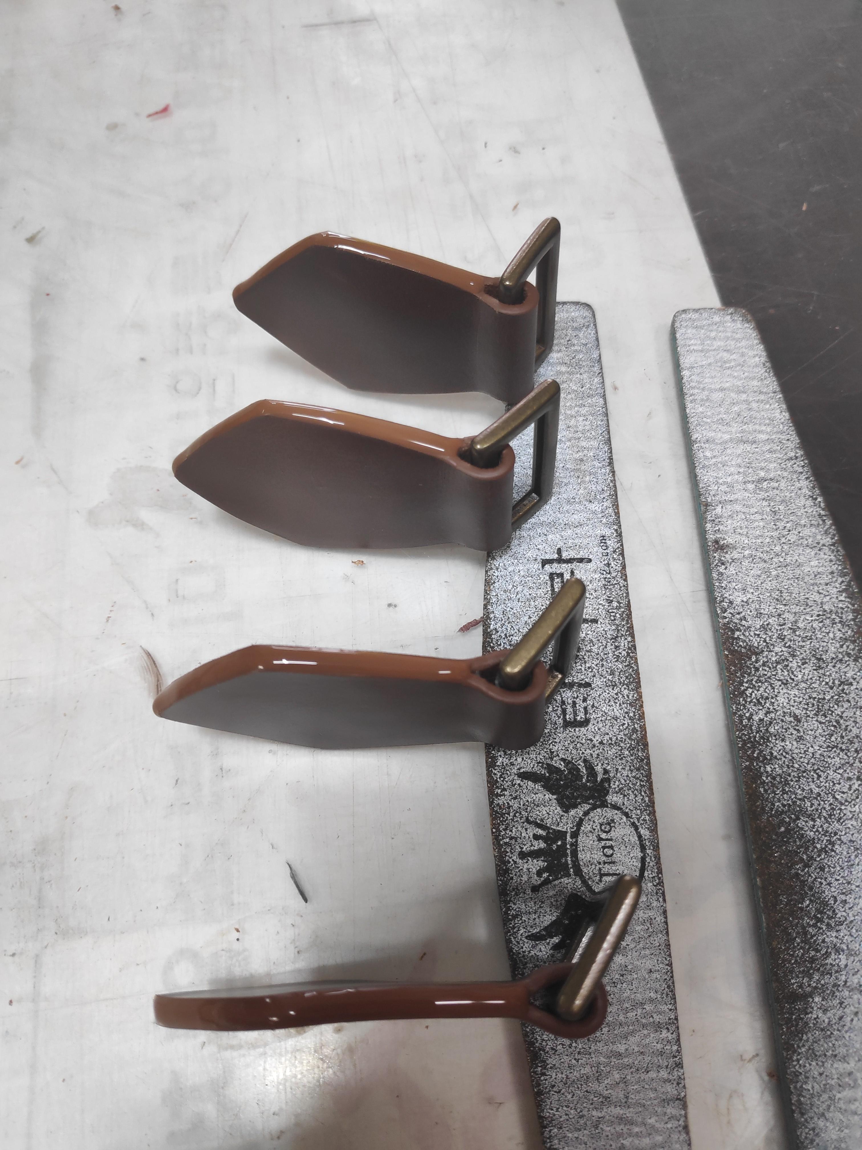 가방을 들었을 때 바깥쪽으로 보이는 지퍼 부분에 들어갈 지퍼입니다. 하지만 추후에 더 밝은 색의 지퍼로 변경합니다. 그 위에 커터 날 옆에 있는 구리색 부품들은 추후에 어깨 끈과 손잡이에 들어갈 부품을 의논한 겁니다.