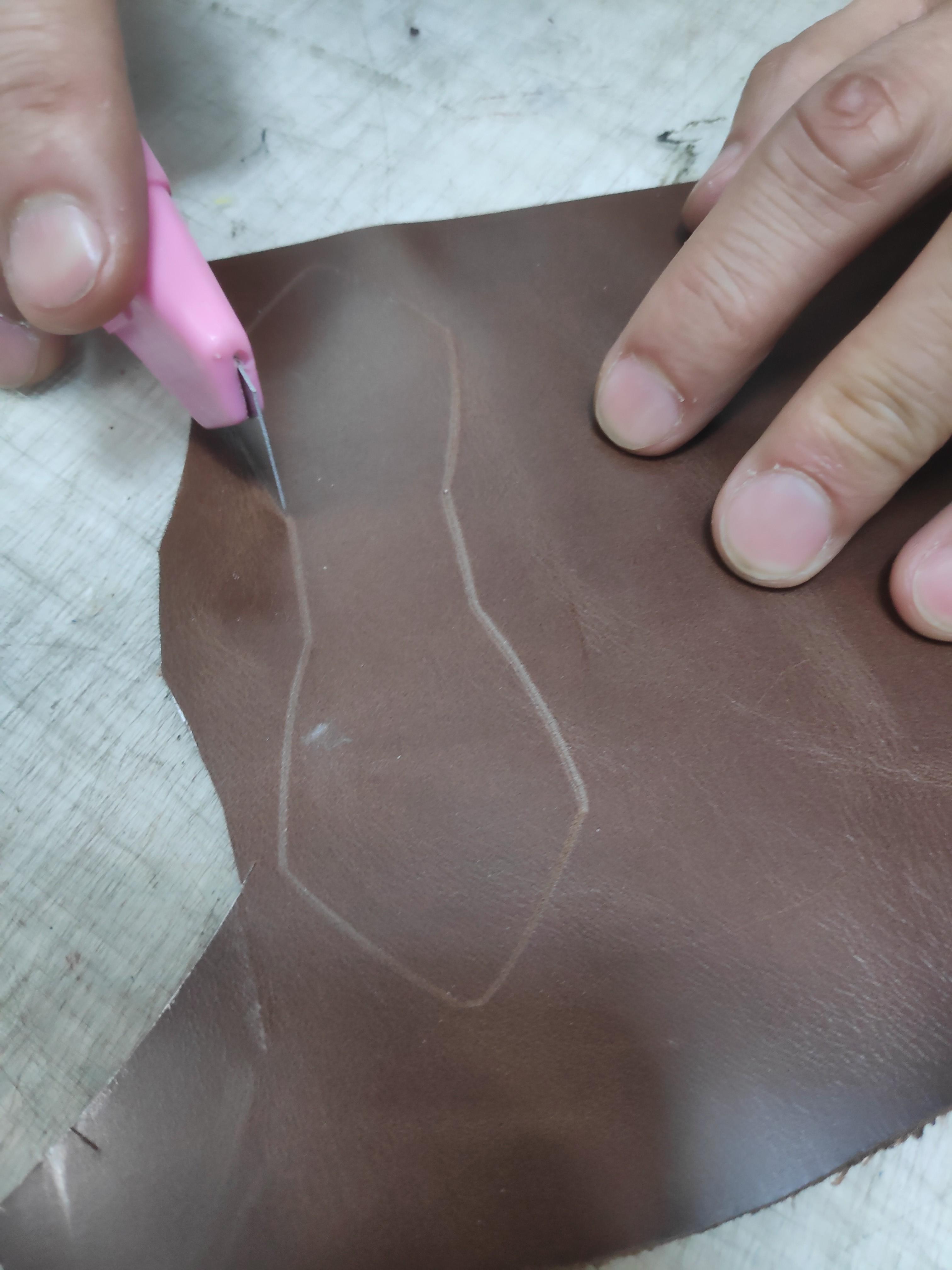 사진의 분홍색 커터칼은 가죽 전용 커터칼로 일반용보다 훨씬 날카롭고 강한 날을 사용합니다. 그리고 가죽을 자를 때는 하나 자르고 교체하는 작업을 반복합니다. 조심해야 합니다.