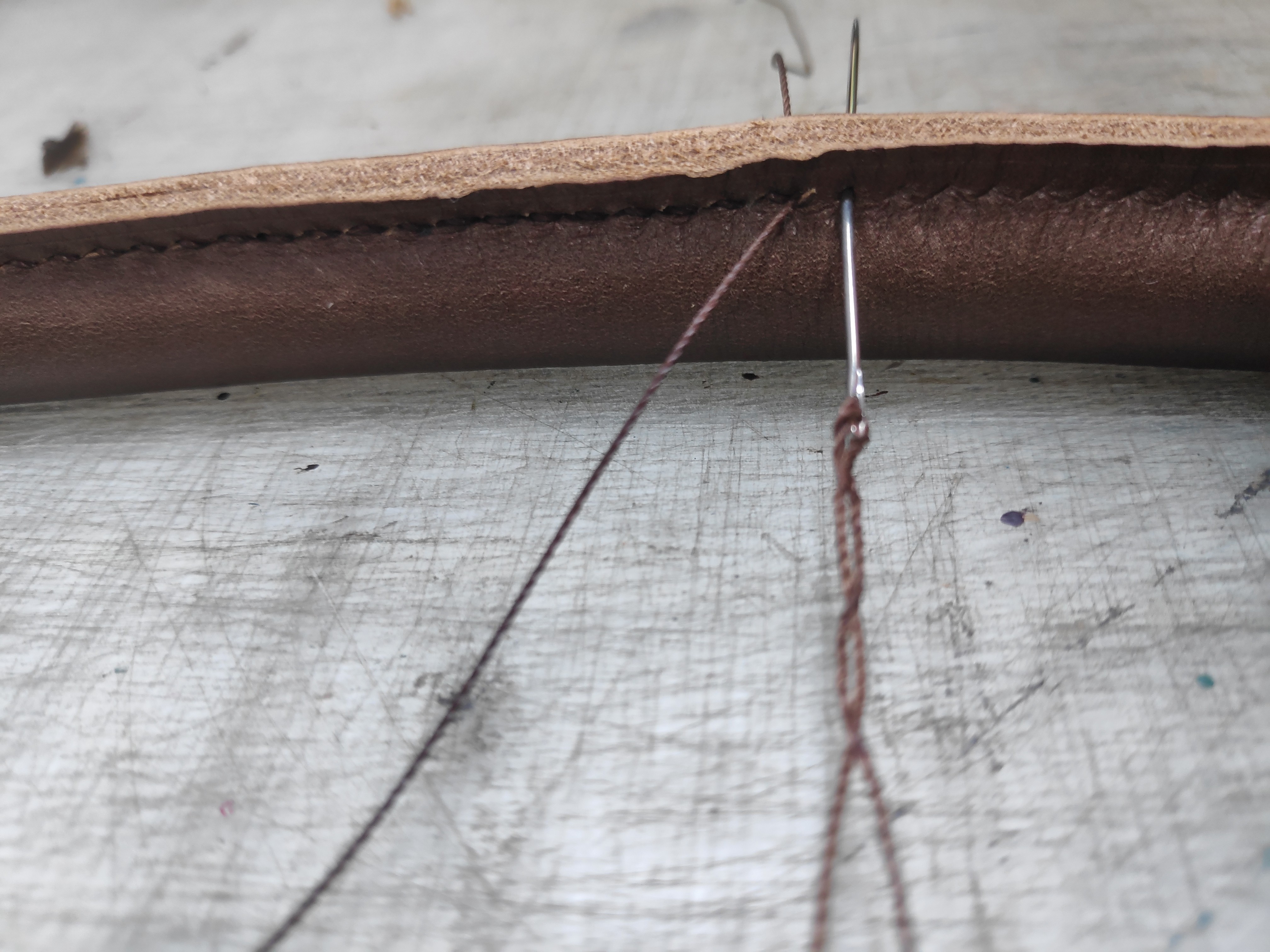 위 사진을 보시면 날개 부분의 네 모서리 부분의 면적이 조금 늘어났다는 걸 알 수 있습니다. 손잡이 바느질을 끝내고 에지 코트를 칠하고 말리면서 다시 바느질한 날개 부분까지 같이 찍어봤습니다.