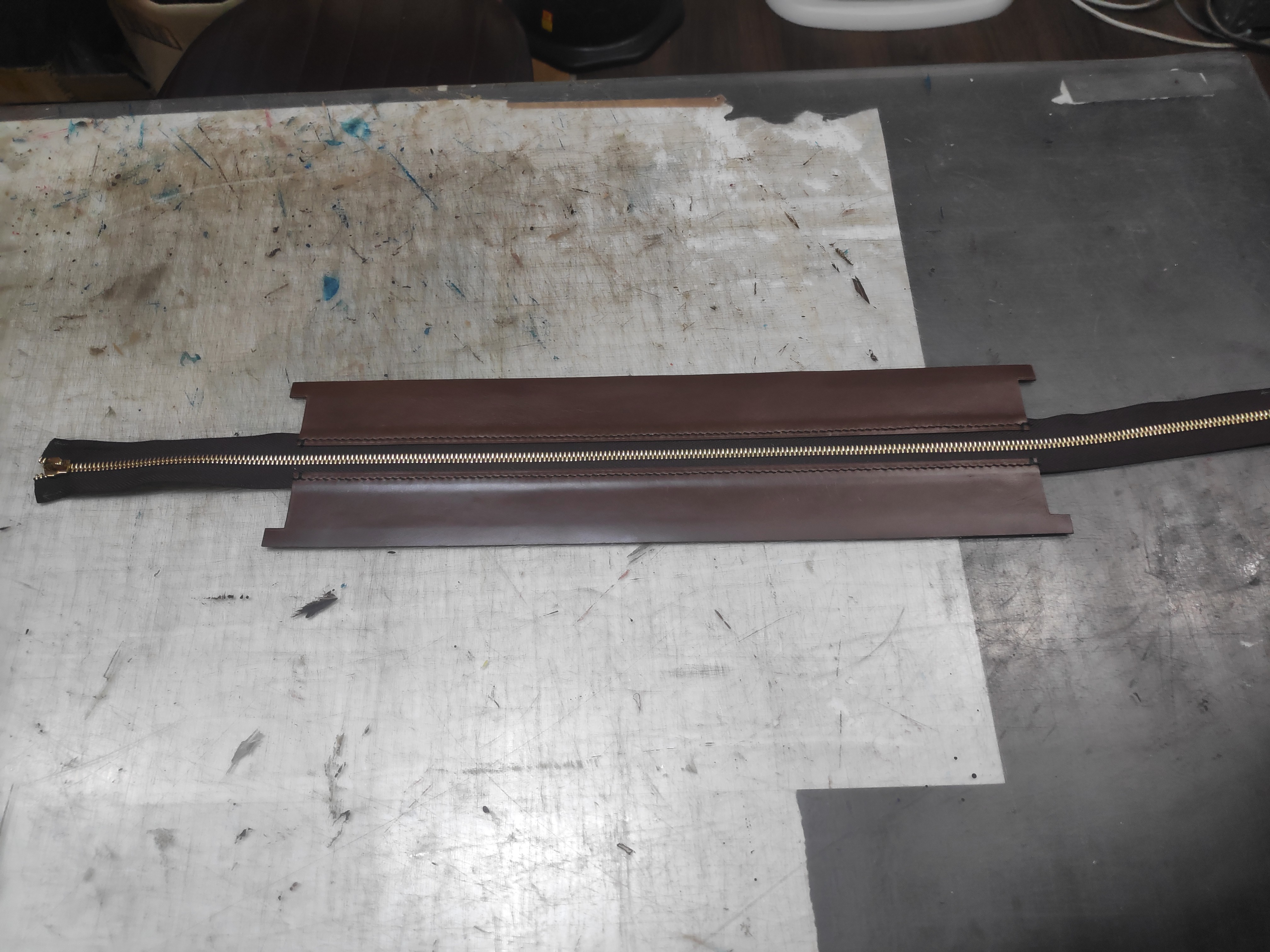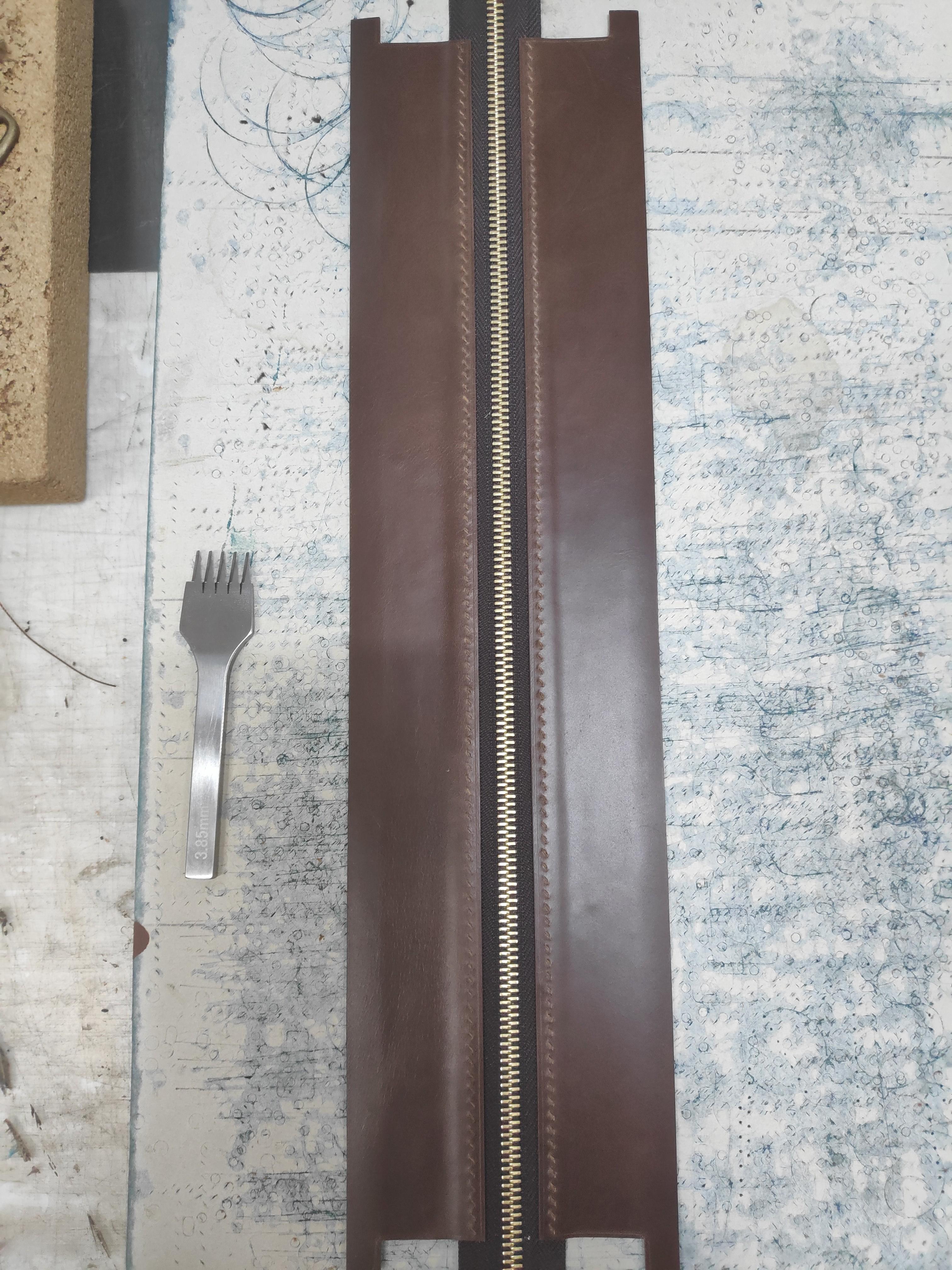 다음은 메인 지퍼의 양쪽에 붙는 날개 부분 가죽을 작업하기 전 세팅입니다. 지퍼가 분리돼있는데 선생님께서 지퍼도 위아래가 있는데 그게 감으로만 알 수 있다고 하셨습니다. 저는 이리저리 봐도 어디가 위인지 모르겠더라고요..