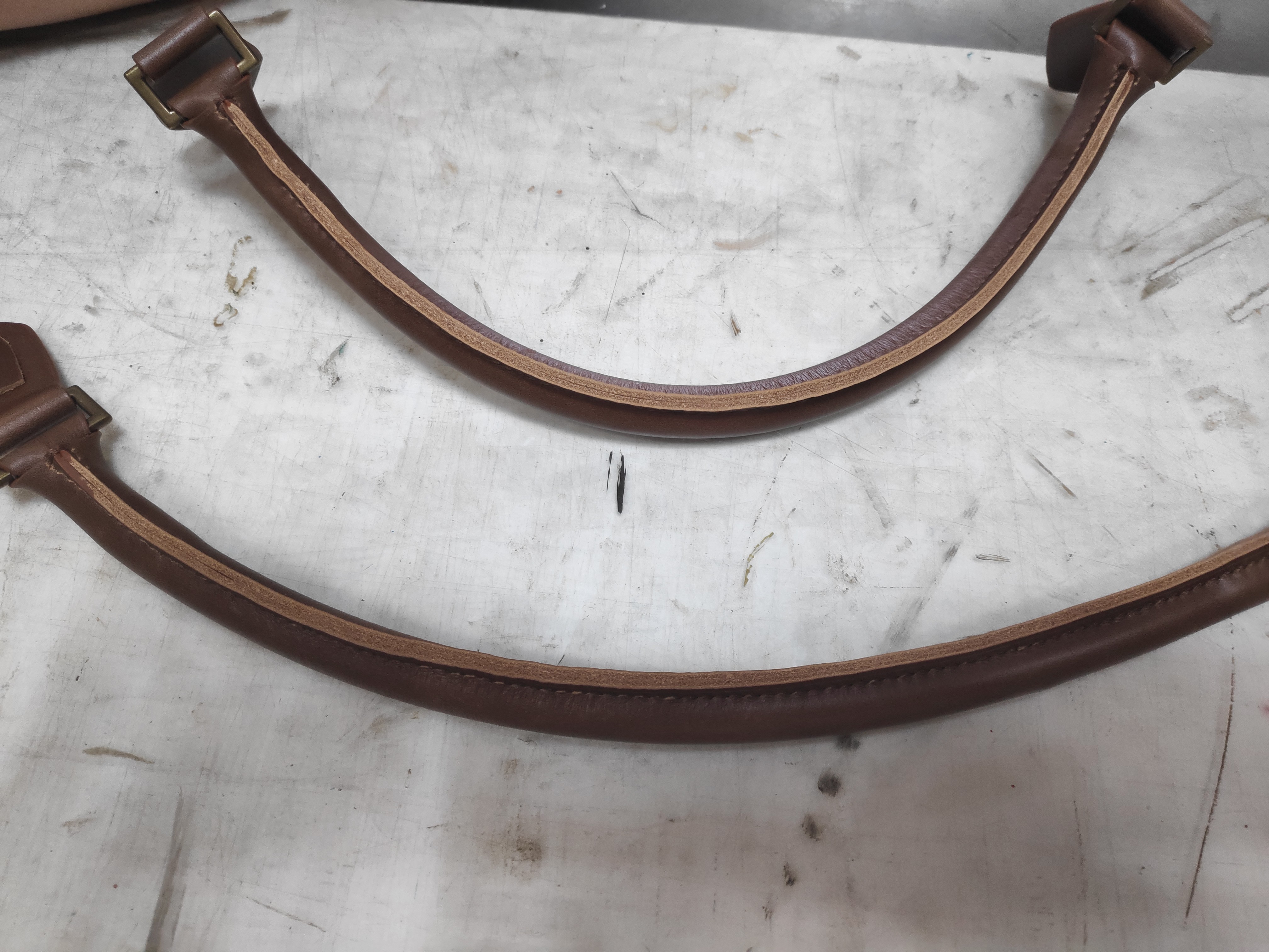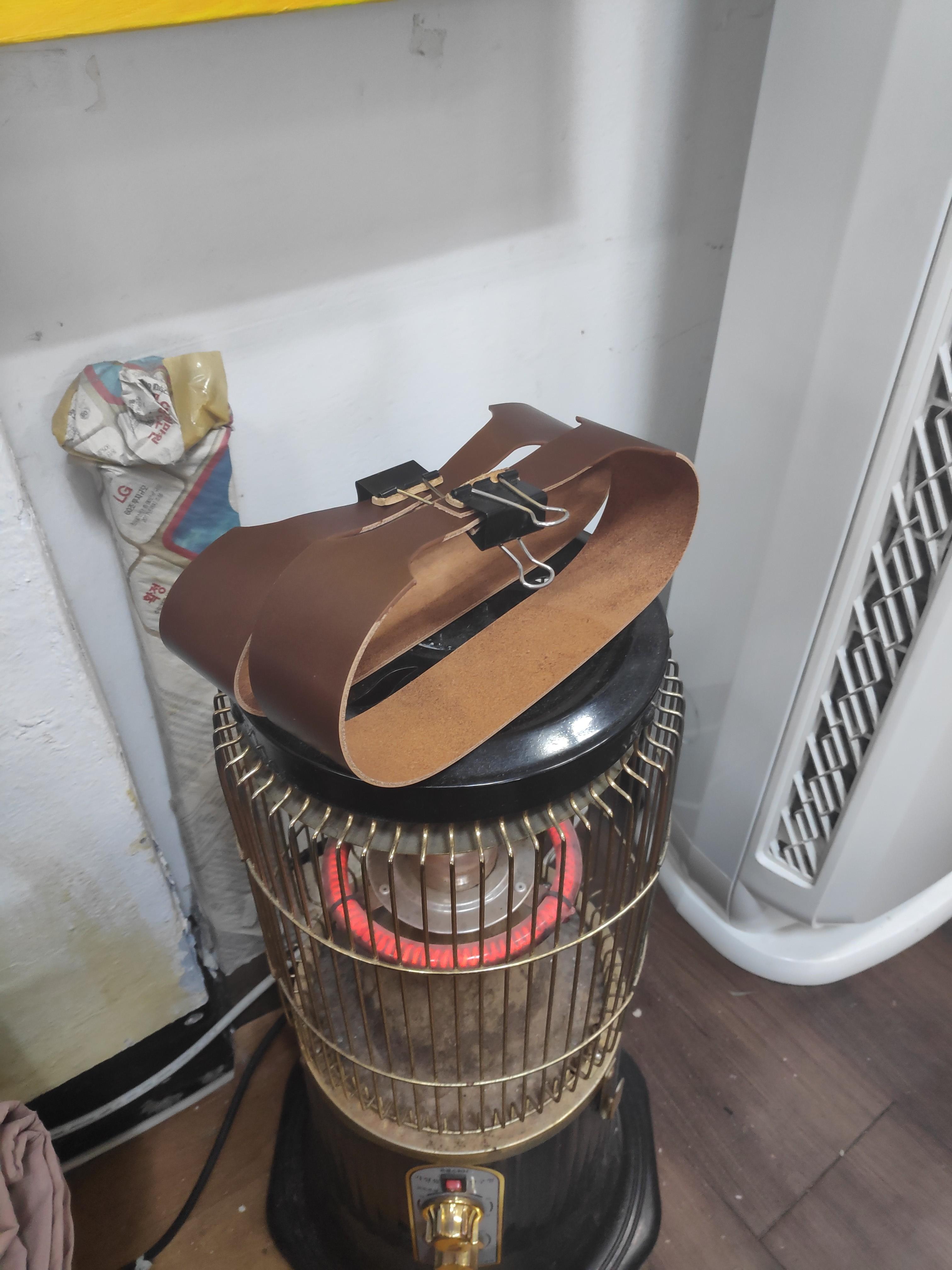 이다음은 손잡이 부분입니다. 손잡이는 양쪽 끝이 한 번 봉해지면 에지 코트를 칠하기 애매해지기 때문에 미리 칠해두는 작업을 해줍니다. 엣지 코트를 말리기 위해 난로 위에 올려두면 가죽이 타지 않을까 했지만 괜찮았습니다.