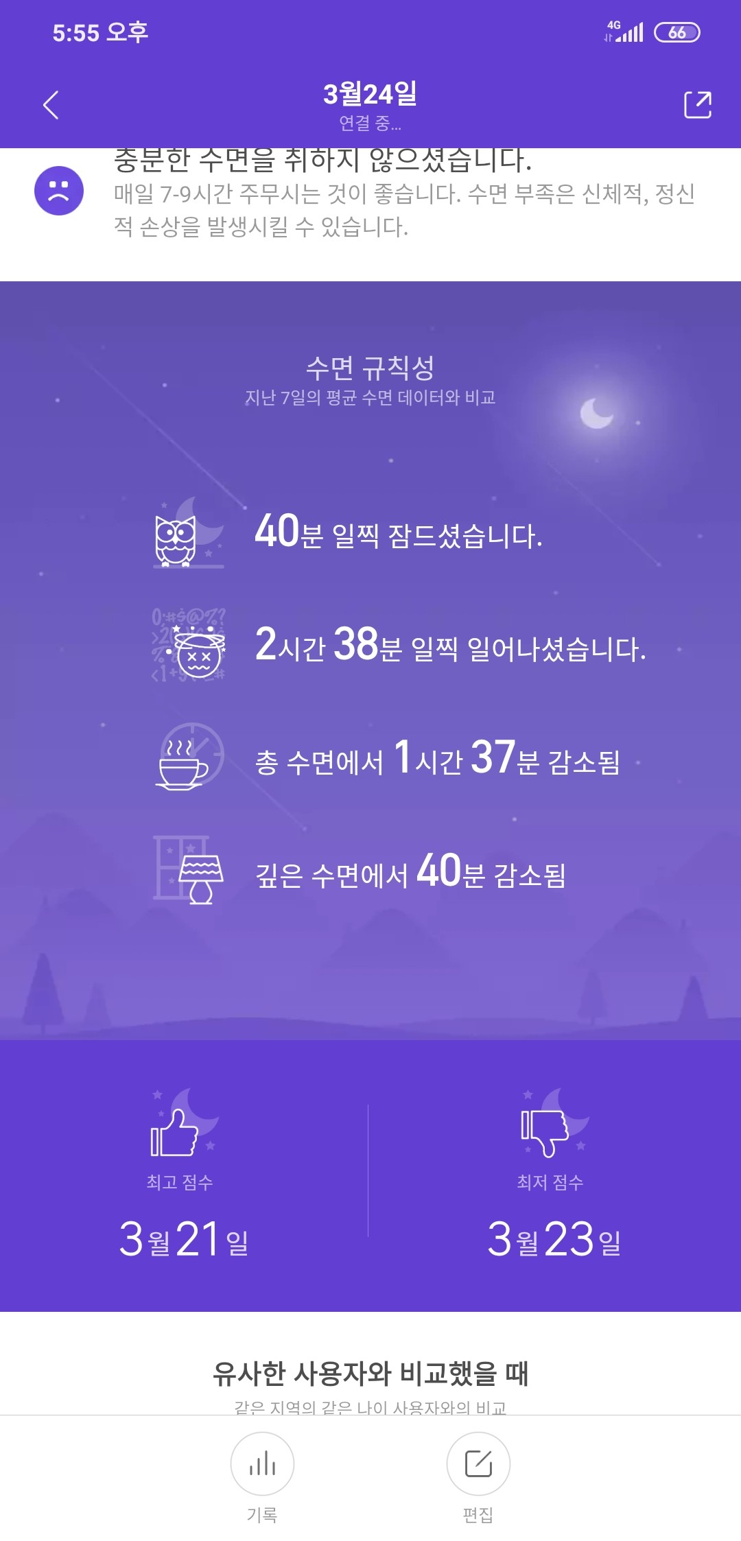 Amazfit GTR의 경우에도 어플과 연동하여 수면 측정 기능을 사용할 수는 있지만 착용하고 자기엔 너무 큰 제품입니다.. 미밴드3가 딱이죠!!