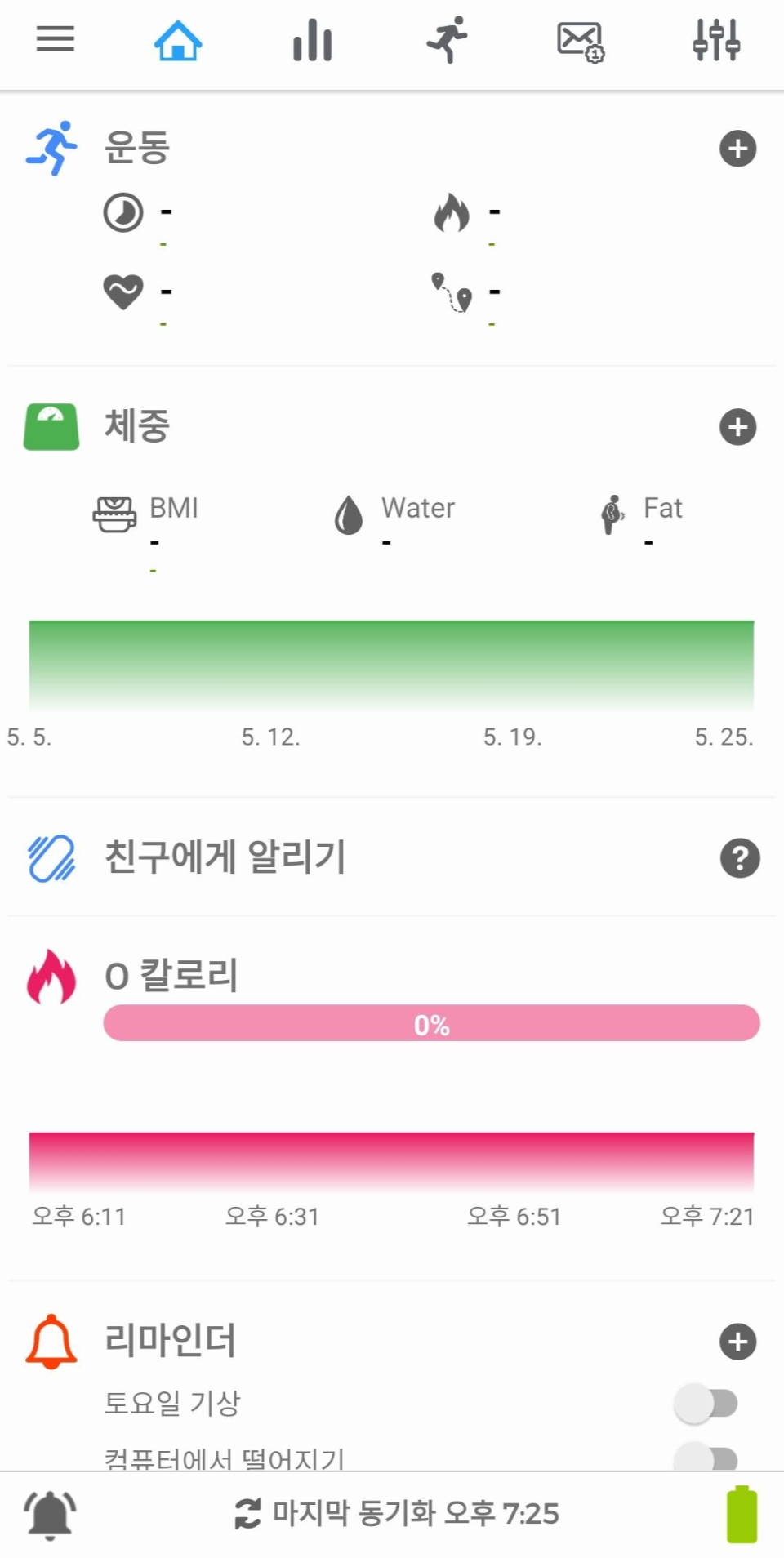 더 아래로 내려가면 운동 체크(운동 시간, 칼로리 소모, 심박수, 운동 거리)를 할 수 있고 체중란도 있습니다. 샤오미 체중계가 있기 때문에 연동해서 사용할 수 있는 걸로 보입니다.