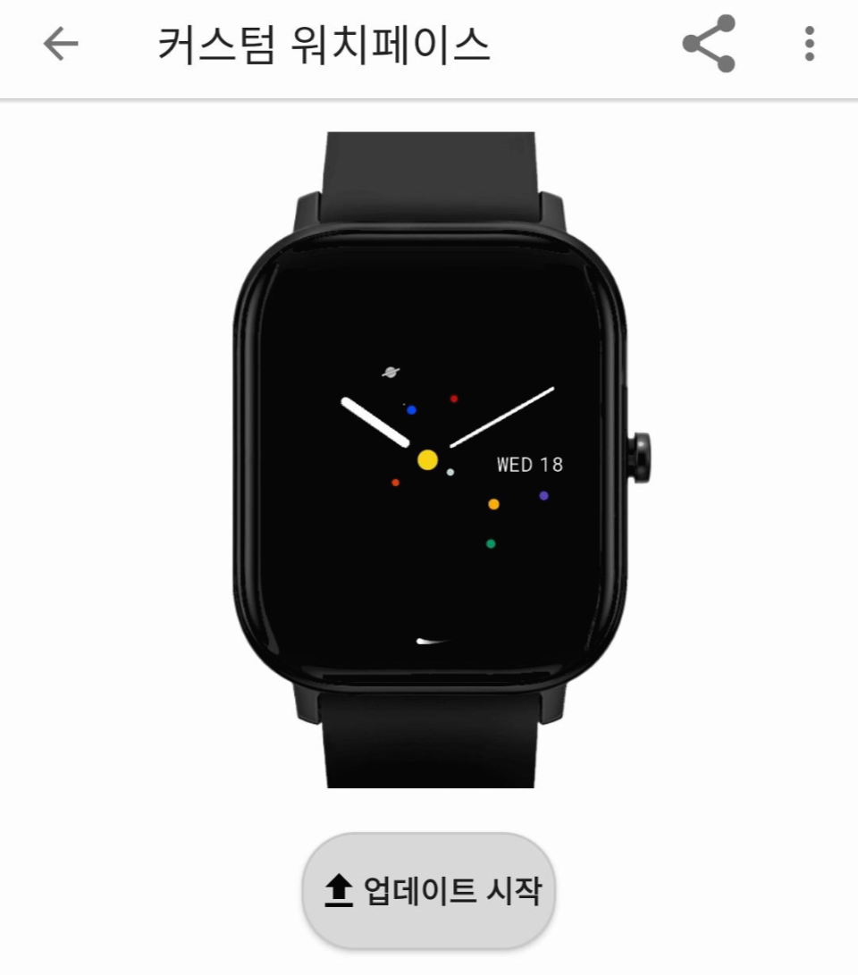 제가 이전 포스팅에서 말씀드렸던 커스텀 워치 페이스를 인기순과 최신순으로 구경할 수 있습니다. 즉석에서 자신의 스마트 워치에 적용도 시킬 수 있습니다. 업데이트 시작을 터치하면 위의 워치 페이스를 적용시킬 수 있습니다.