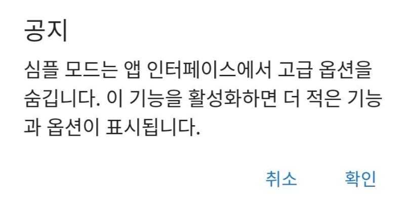 심플 모드는 앱을 더 단순하게 보는 모드입니다. 언뜻 보면 쉽게 볼 수 있으면 무조건 좋은 게 아닌가? 생각할 수 있지만 다음 사진과 같이 기능을 전부 활용할 수 없게 됩니다.