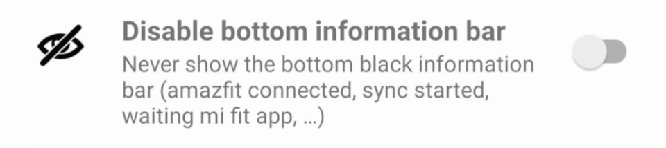 Disable bottom information bar는 하단에 뜨는 알림 바를 없애는 기능입니다.(Amazfit 연결 여부, 동기화 시작 등)