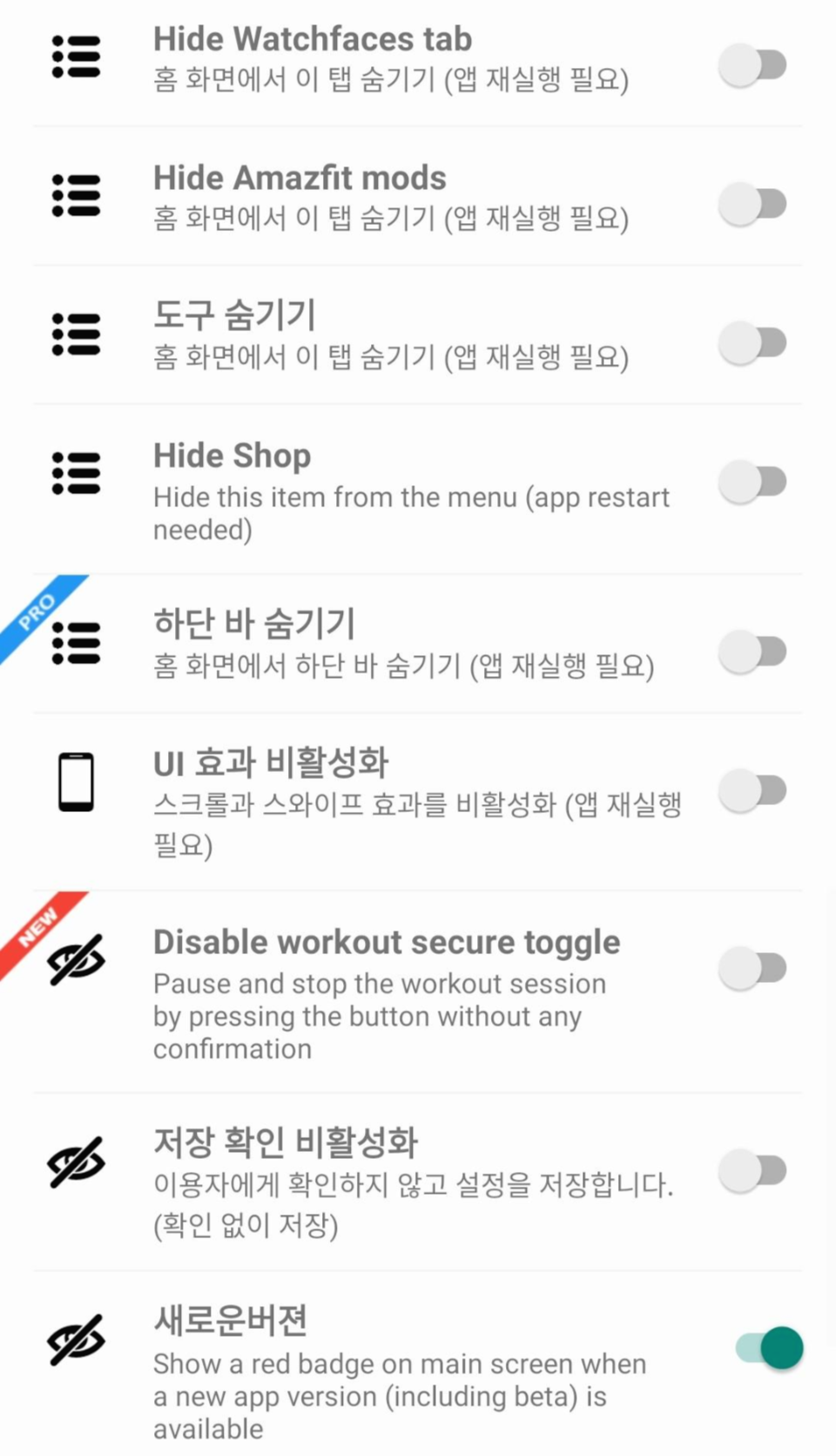 홈 화면, 걸음, 수면, 심박, 운동, 칼로리, 체중, 앱 메뉴, Maps, Assistant tab, 전화, 리마인더, 알람, 버튼 메뉴, Watchfaces tab, Amazfit mods, 도구, Shop, 하단 바 숨기기들은 전부 홈 화면에서 메뉴를 숨기는 옵션들입니다. 사용하지 않는 기능들을 굳이 띄워놓을 필요는 없겠죠.