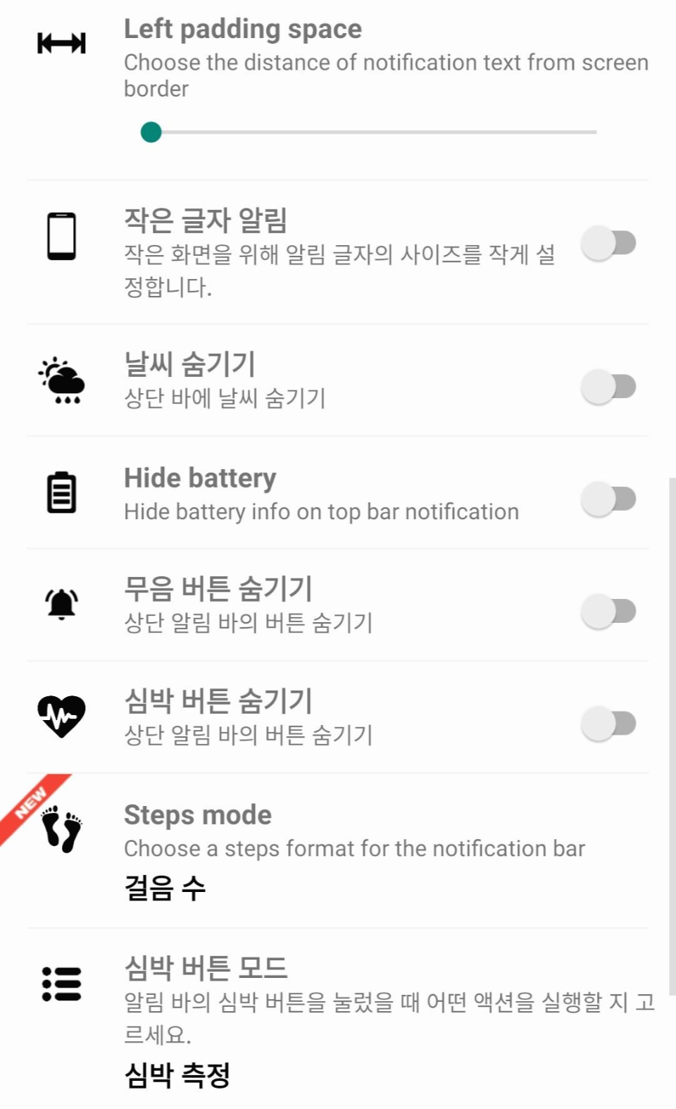 날씨, battary, 무음 버튼, 심박 버튼 숨기기는 각 기능을 숨기는 기능입니다. 이 기능이 왜 또 있냐 헷갈리실 수 있으니 설명드리면 아까는 메인 화면에서 숨기기로 이번에는 알림 바에서 숨기는 기능입니다.
