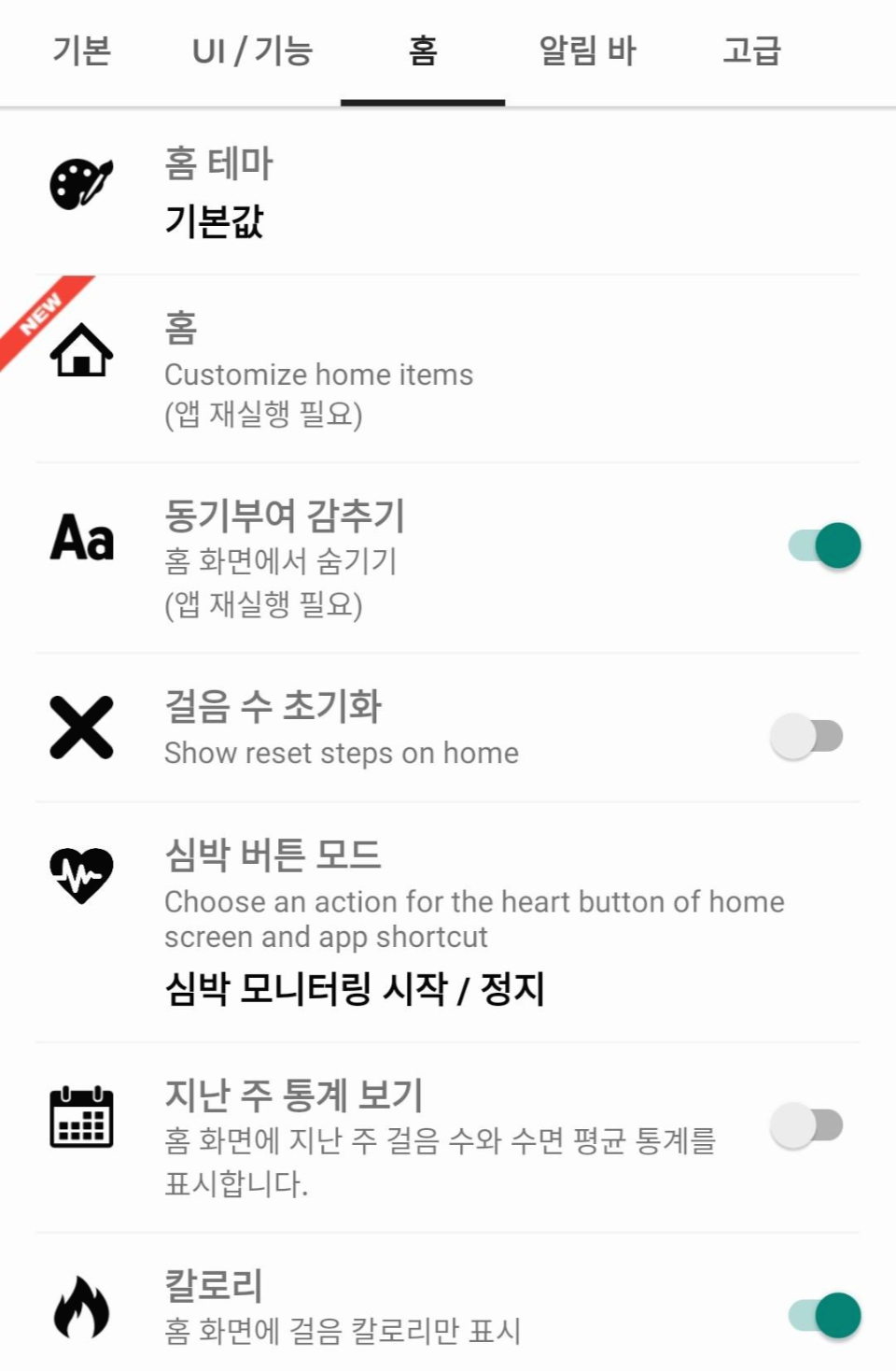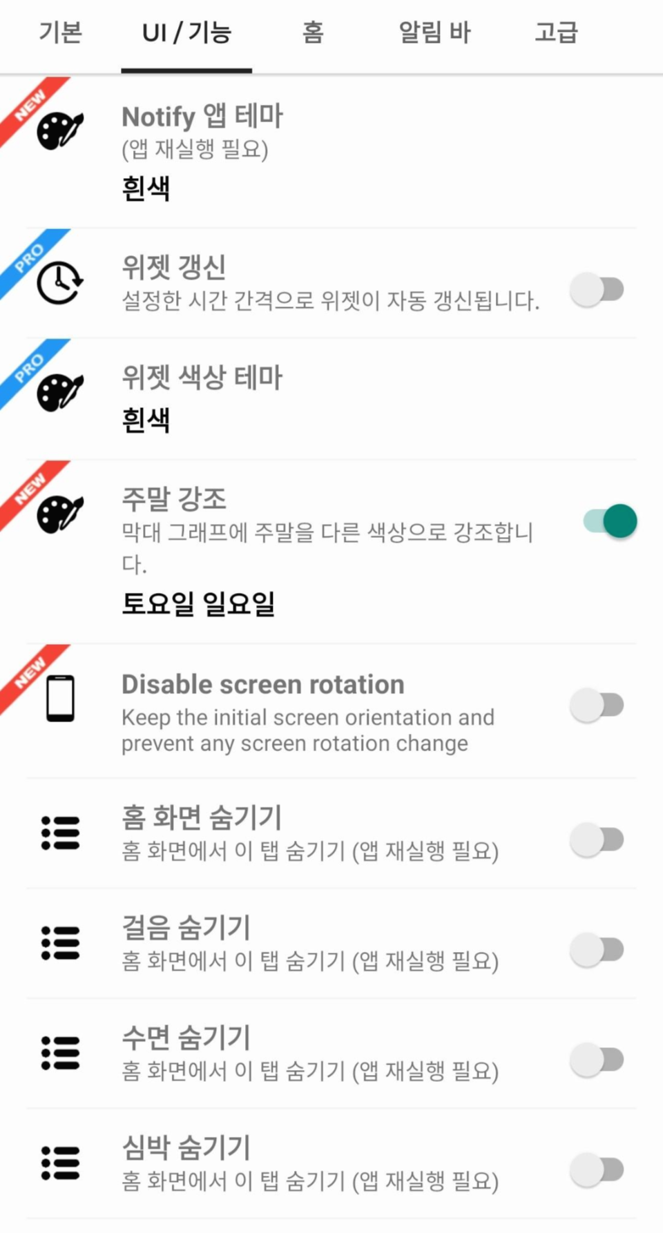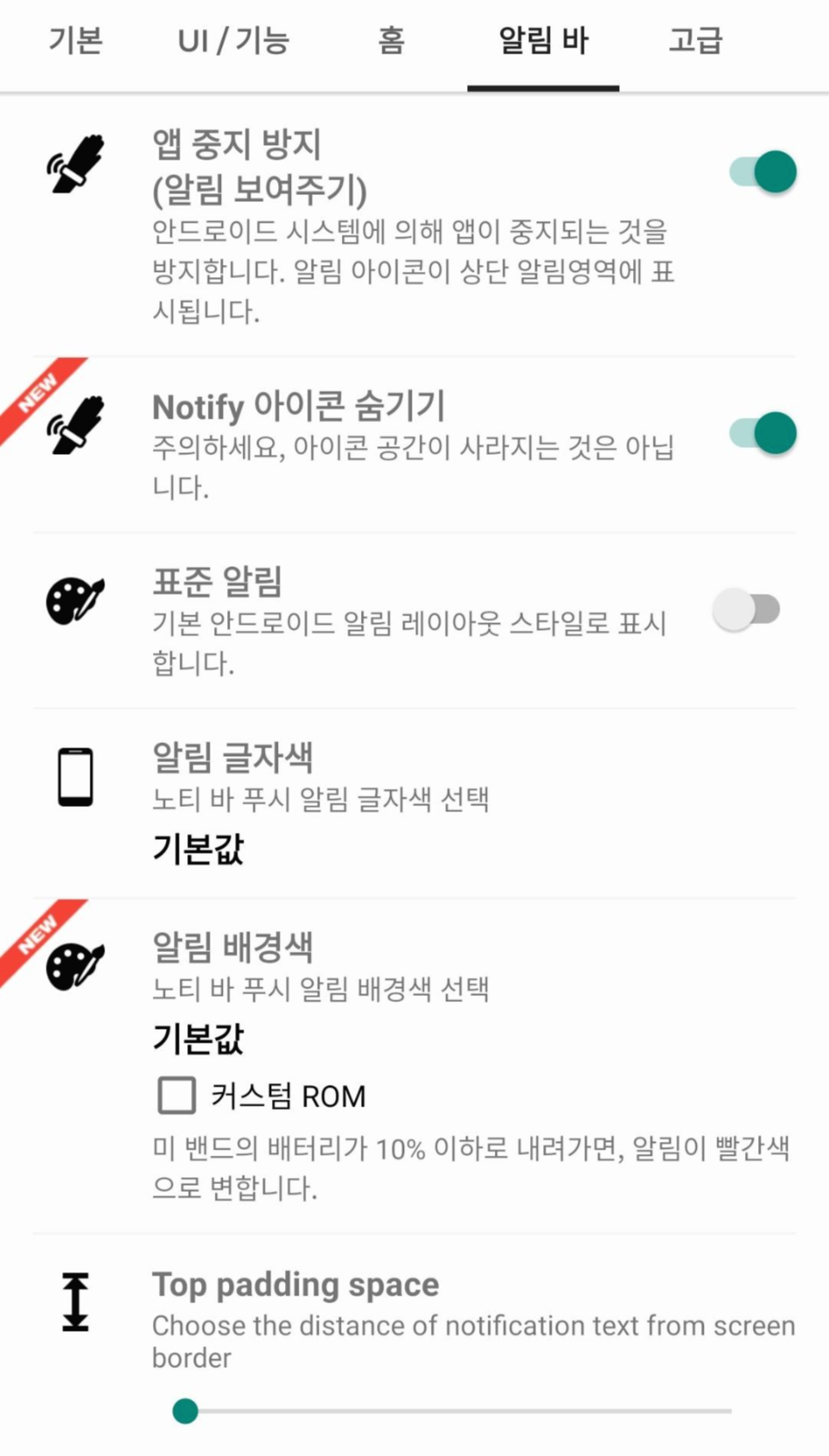 앱 설정(기본, UI / 기능, 홈, 알림 바, 고급)