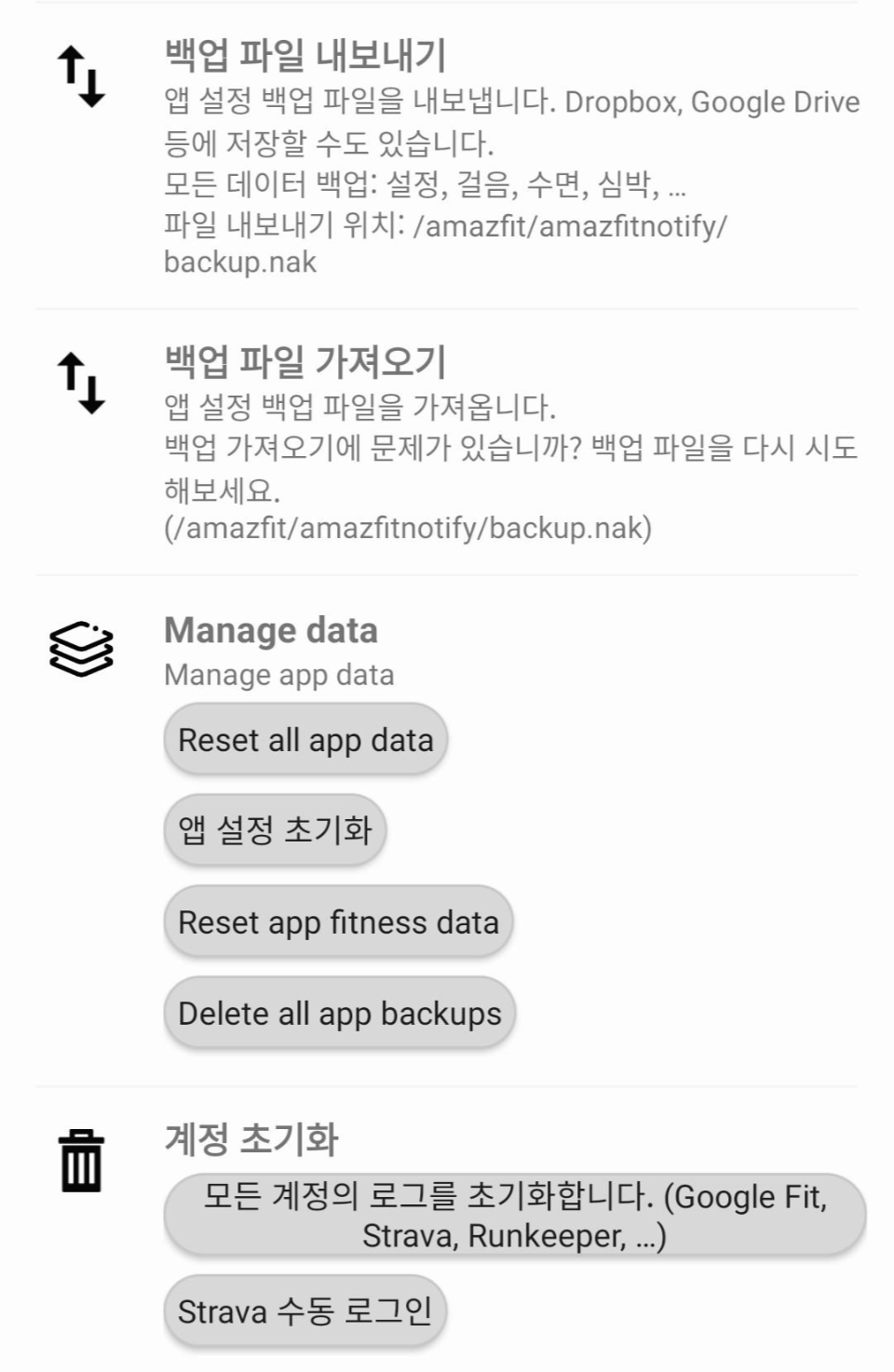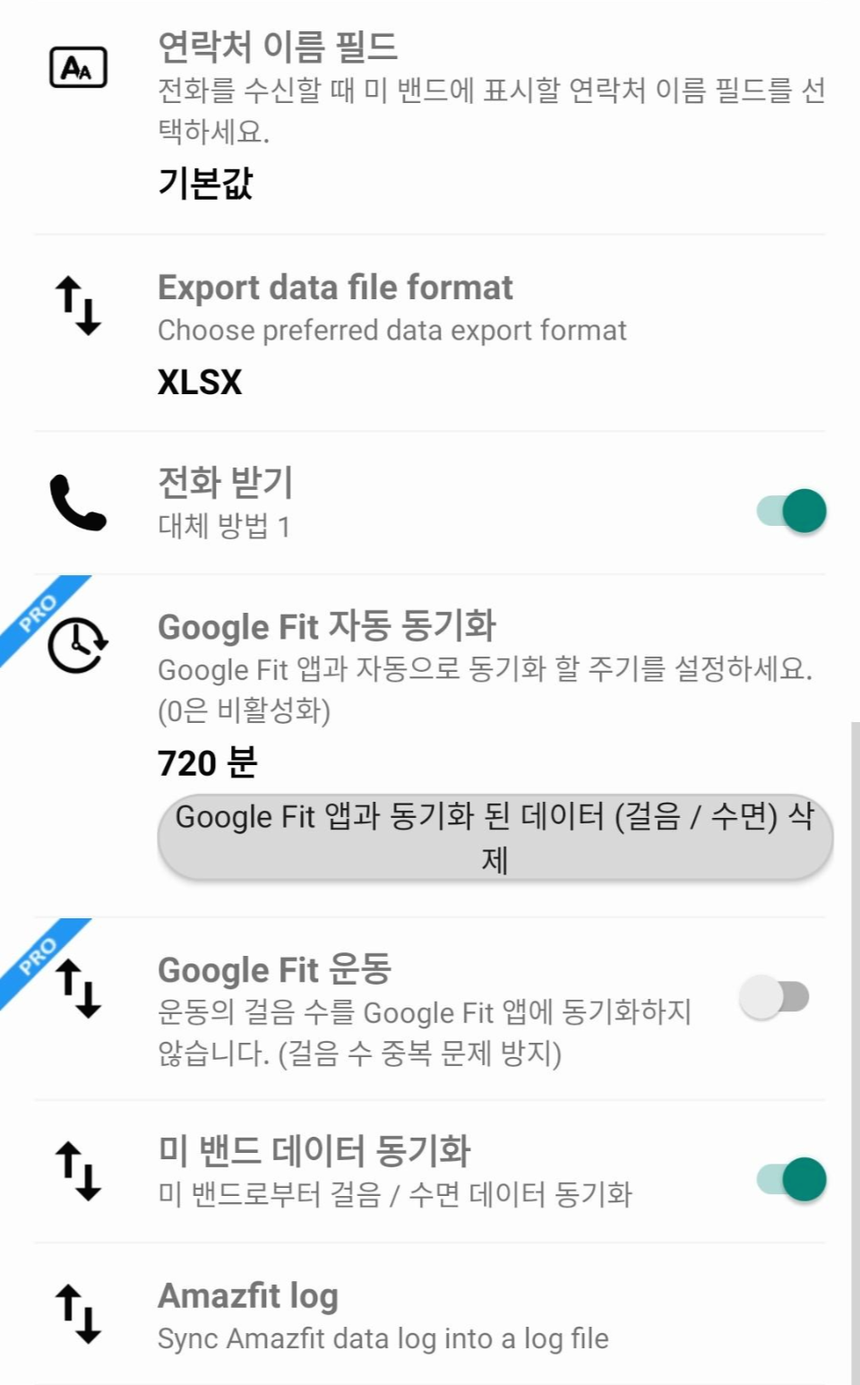 Amazfit log는 Amazfit 앱의 로그 파일을 가져와서 동기화시키는 옵션입니다.