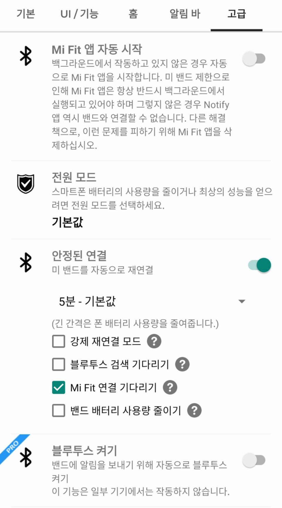안정된 연결은 미 밴드를 자동으로 재연결하는 기능입니다. 재연결 시간도 정할 수 있습니다. 기본값은 5분입니다. 강제 재연결 모드 등이 있는데 일단은 기본으로 사용하는 게 좋아 보이고 연결이 너무 안 될 결우 강제 연결을 사용해보시면 좋을 거 같습니다.
