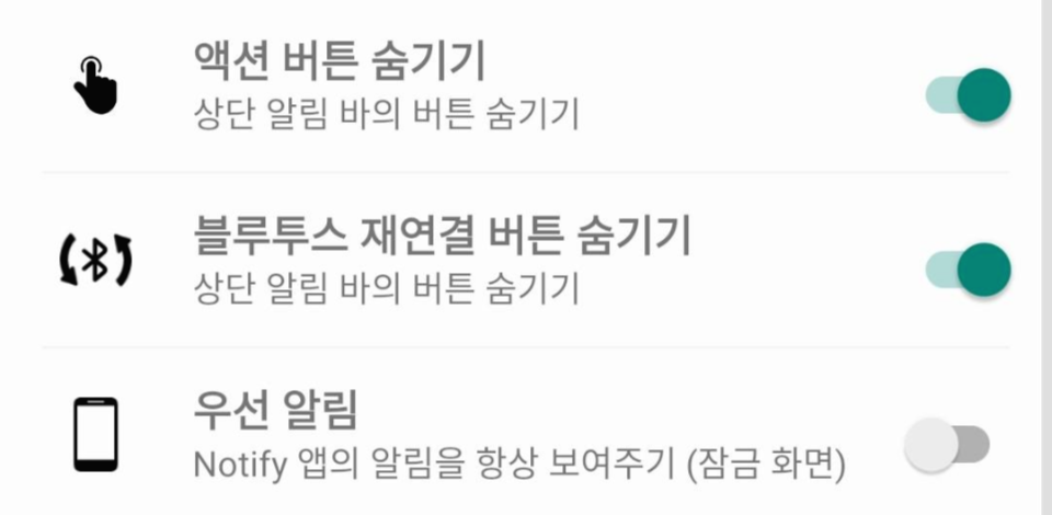 액션 버튼 , 블루투스 재연결 버튼 숨기기는 말 그대로고 우선 알림은 카톡, 문자 다 제치고 노티 앱 알람을 제일 상단에 올리는 기능입니다.